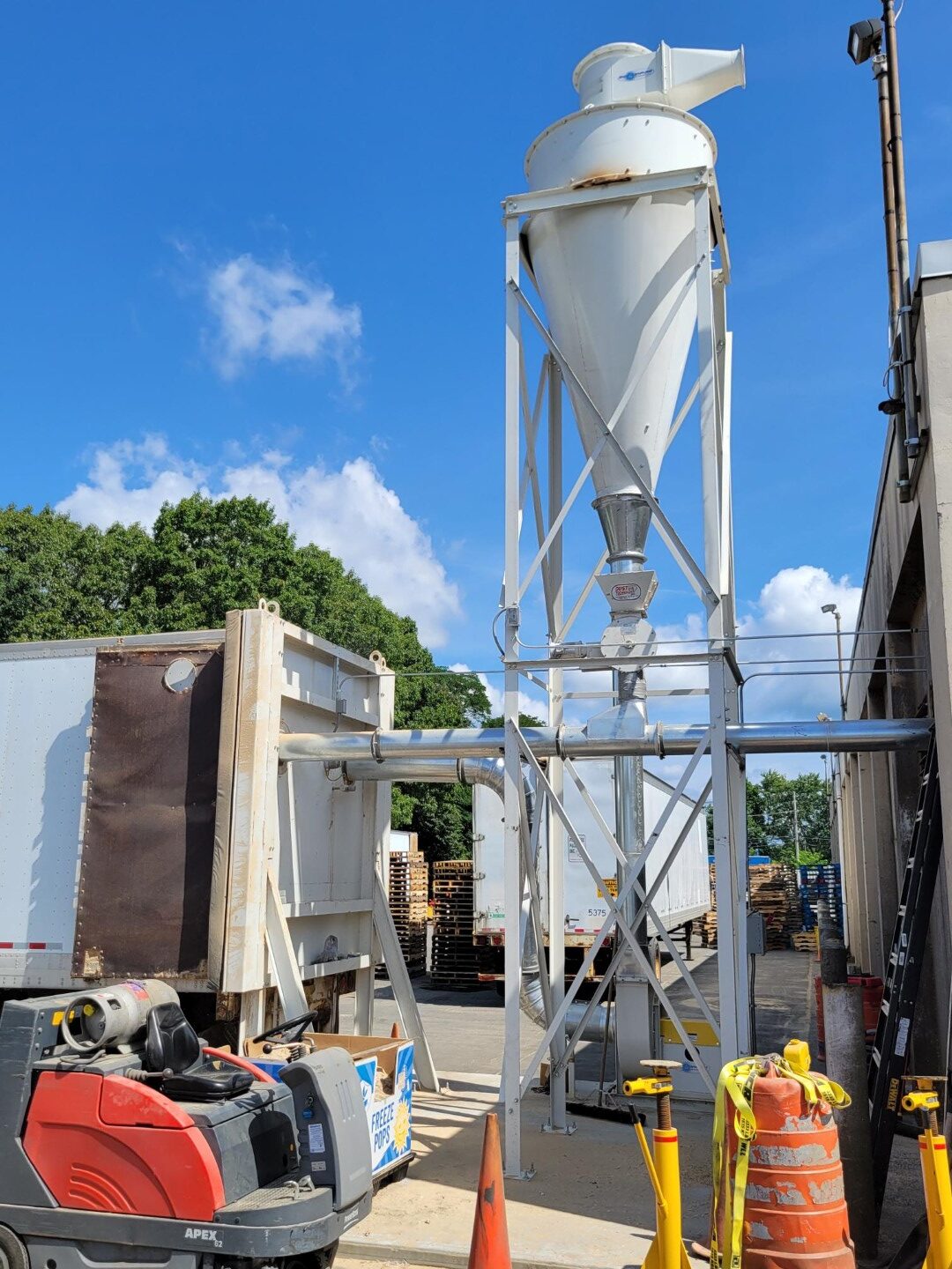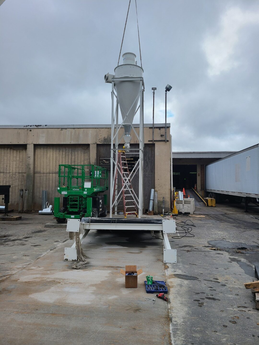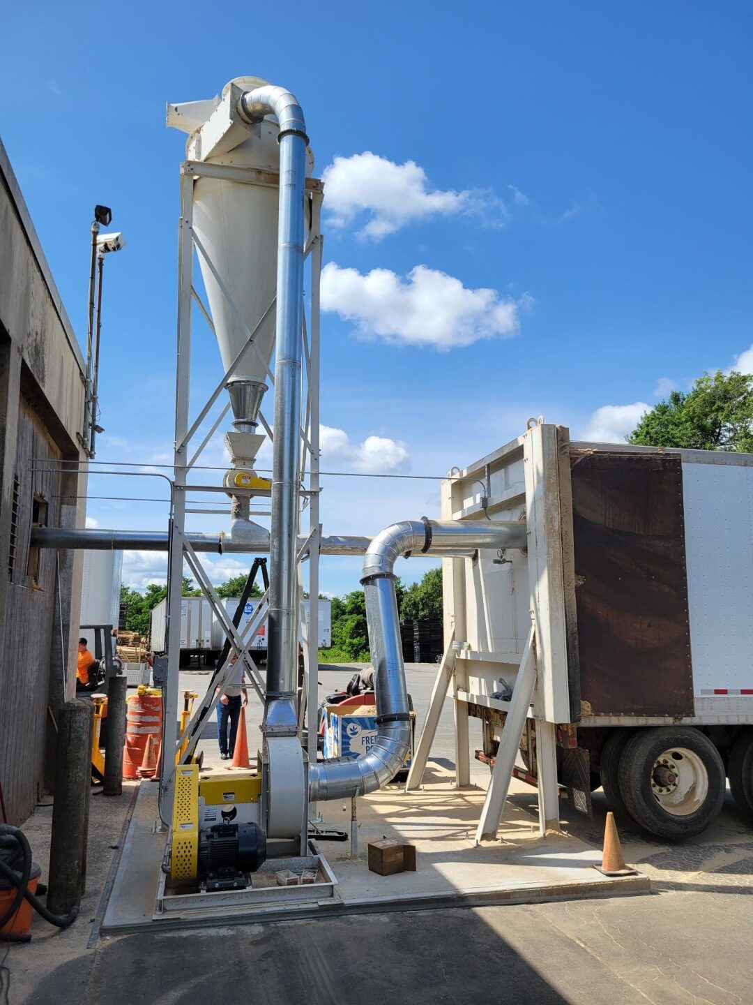 Boulware Equipment designed and installed a complete process dust collection system tailored specifically for the needs of Progress Pallet. The system is a closed loop Pneumatic trailer loader to load 5 Ton / hr into an enclosed Wood chip trailer. Dust is controlled during the process with no emissions. The system handles 5 TPH from a Cresswood Grinder with Secondary Hammermill.