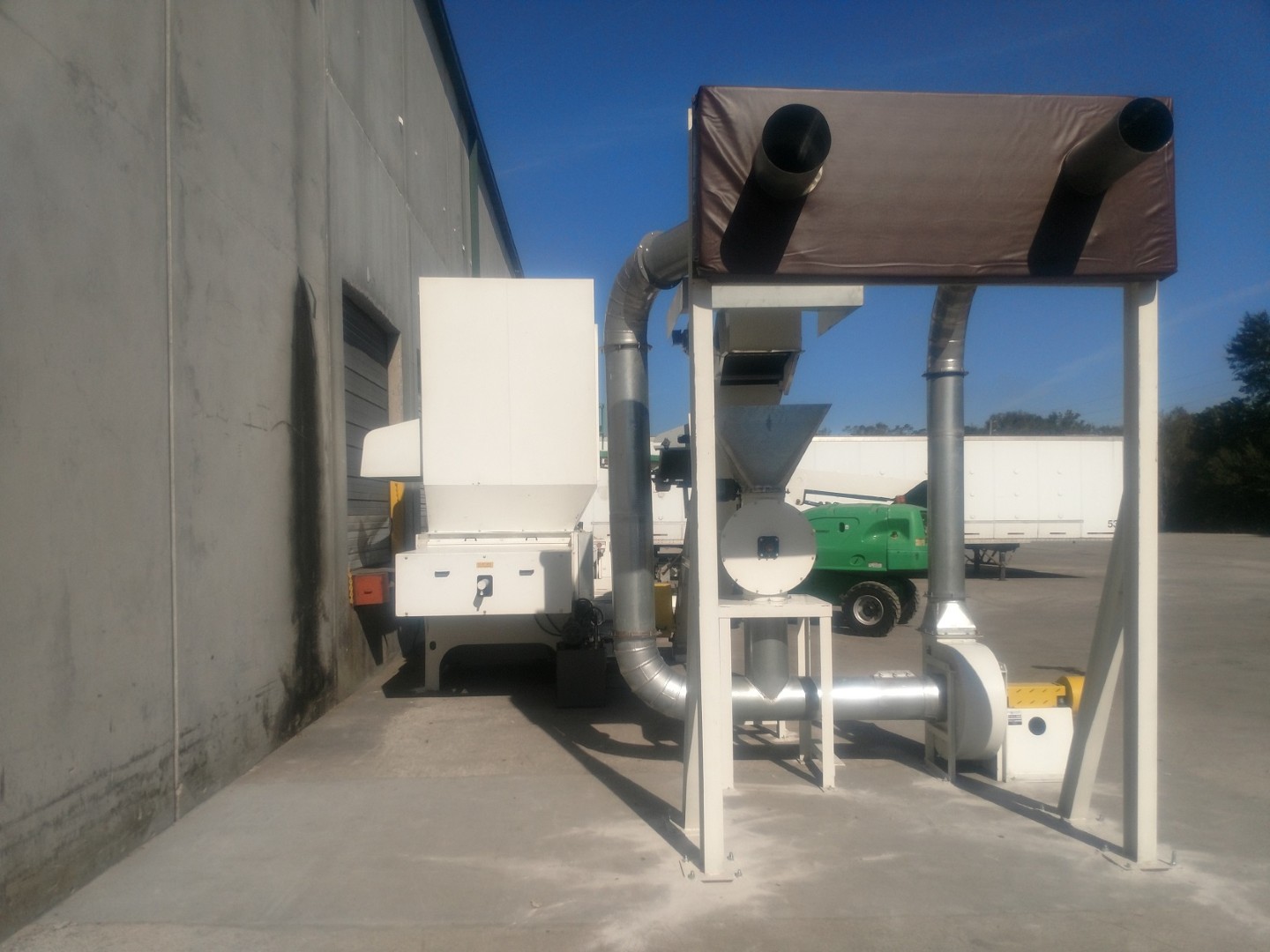 The processed wood trash is then conveyed into a waiting truck trailer, ready to be hauled off and sold.